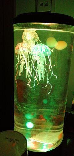 Pour créer votre propre exposition marine personnelle, il suffit de remplir l'aquarium avec de l'eau du robinet, d'ajouter une ou deux gouttes de détergent liquide pour la vaisselle et d'y déposer les méduses. Sans avoir à vous soucier de l'entretien, il ne vous reste plus qu'à l'allumer pour profiter de la danse sous-marine colorée.